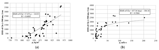 Relationship between RMS of Cla and density (a) and dynamic viscosity (b) [102].