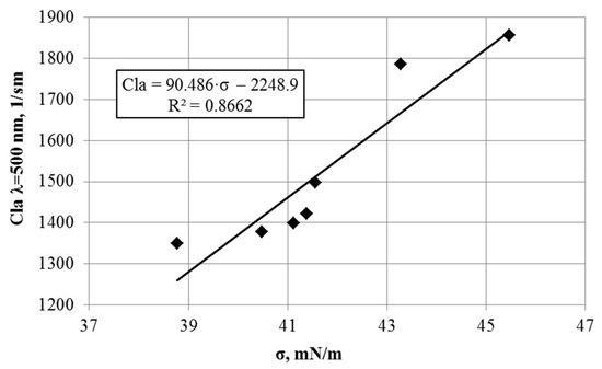 At the same time, the optical properties of oil are well correlated with the physical characteristics of oil, such as density, viscosity and interfacial tension. As a result, linear and logarithmic relationships between the coefficient of light absorbance and the root mean square value (RMS) of the coefficient of light absorbance were obtained: from density (Figure 5a), from dynamic viscosity (Figure 5b) [102] and interfacial tension (Figure 6) [101].