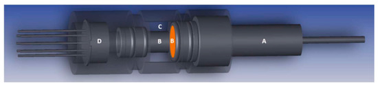 Sectional diagram of a microsensor. A—light source, B—sapphyric glass (right) and rod (left), C—space for liquid, D—quad-core photo receiver [108].
