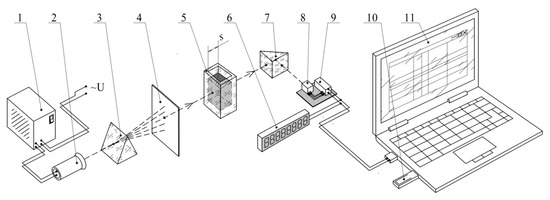 The devices for D and Cla of oil (Figure 9) include the following principal components: (1) power supply source; (2) emitter sensor; (3) prism; (4) cross-section with the probe; (5) hood with the fluid sample; (6) display; (7) reflection grid; (8) receiver sensor; (9) signal converter; (10) memory and data logger; and (11) data processing device.