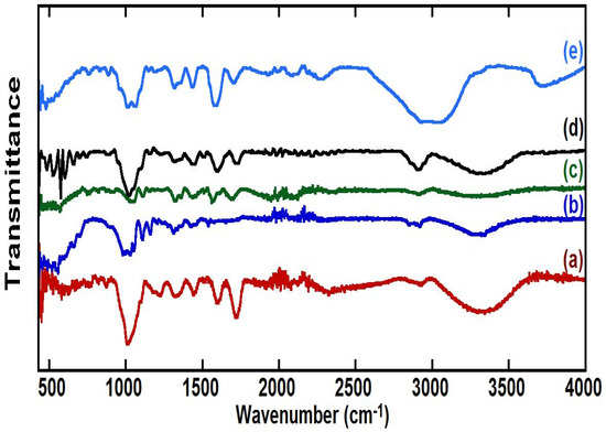 FTIR of (a) dried and ground pomegranate peels (PPs), (b) pomegranate peels after basic treatment (BPPs), (c) after hydrothermal carbonization treatment (HTC-HC), (d) after microwave-assisted hydrothermal carbonization treatment (HC) and (e) after microwave-assisted hydrothermal carbonization treatment in the presence of ZnCl2 (AHC).