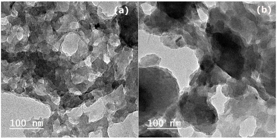 (a) TEM images of hydrochar (HC) after the microwave-assisted hydrothermal carbonization treatment and (b) activated hydrochar (AHC) after the microwave-assisted hydrothermal carbonization treatment and chemical activation by ZnCl2.
