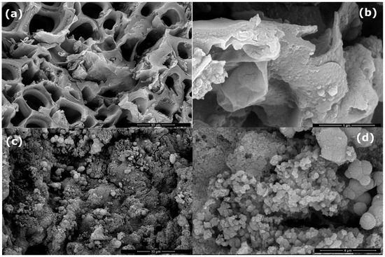 (a,b) SEM images of hydrochar (HC) after the microwave-assisted hydrothermal carbonization treatment and (c,d) SEM images of activated hydrochar (AHC) after the microwave-assisted hydrothermal carbonization treatment and chemical activation by ZnCl2.