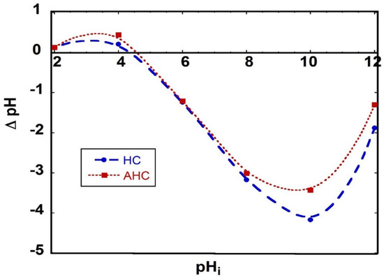 ΔpH as a function of HC and AHC with a solid-to-solution ratio of 1 g/L, stirring at 350 rpm for 24 h and background electrolyte 0.1 NaCl.