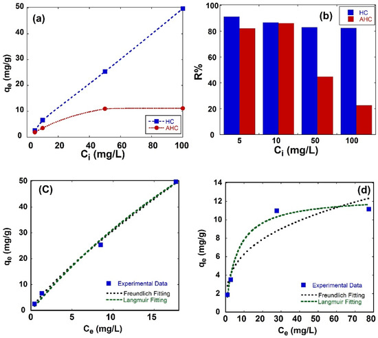 Figure 5b shows the effect of increasing the initial concentration of MB dye (Ci) on the removal efficiency (R%). R% values were 91%, 87%, 83% and 82% for the HC sample and 82%, 86%, 45% and 23% for the AHC sample when the initial concentrations of MB were 5, 10, 50 and 100 mg/L, respectively. In both samples, as the initial concentration of MB dye increases, the removal efficiency decreases, which may be related to the saturation of the adsorbent surface with MB dye. In addition, the removal efficiency observed by the HC sample is always higher than the AHC sample.