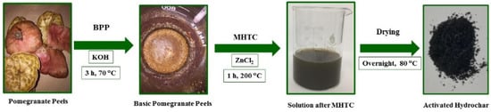 Six grams of BPPs were mixed with 50 mL of deionized water in addition to 10 mL of 6 M ZnCl2 as an activating agent. The MHTC method was executed at 200 °C for 1 h, and this sample is called AHC [6]. The sample was washed and dried at 80 °C overnight. Scheme 1 represents steps of the synthesis.