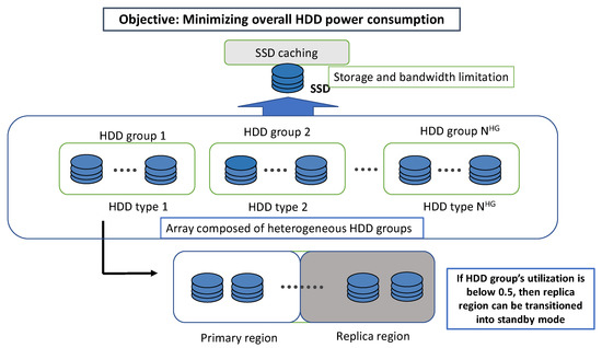 - Idle phase: If no HDD activity is occurring, the HDD is rotating without reading or seeking, which requires the power of . We calculate the total idle time for seconds by subtracting the seek and read times from . However, if I/O utilization over all HDDs in the HDD group is less than or equal to 0.5, then half of HDDs can be put into standby mode, halving the idle time. Let be the I/O utilization for an HDD group m when requests from the first to nth elements of are served from the SSD. is then calculated as follows:Therefore, idle time, can be calculated as follows:Thus, the energy required in the idle phase, , can be calculated as: