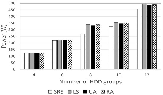- Standby phase: If , then half of HDDs can be put into standby mode. If is the standby power for an HDD group m, then can be calculated as follows: