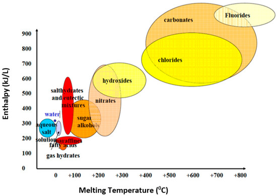 PCMs according to their melting temperatures and enthalpy. Adapted from [10].