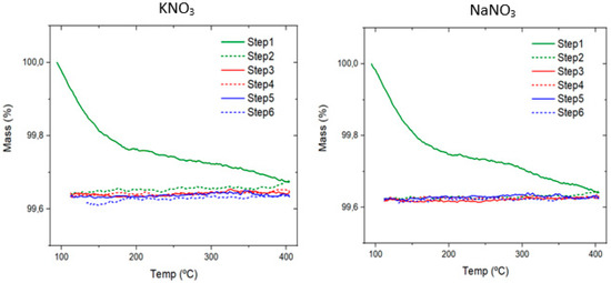 The thermal stability of the molten salts proposed was also tested in Figure 3, Figure 4 and Figure 5. In this case, a similar behavior was obtained for NaNO3 and KNO3 (Figure 3), showing a slight initial weight loss due to water content release (0.35%). For the rest of the thermal cycles, the salt weight remained constant during the time between 100 and 400 °C.