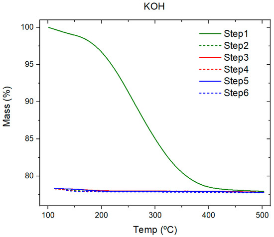 In the case of KOH, the TGA curve (Figure 4) showed a higher first step compared with the sodium and potassium nitrate. The weight lost due to the water content was 23% in the first cycle of the thermal test, after that, the salt weight remained constant between 100 and 500 °C.