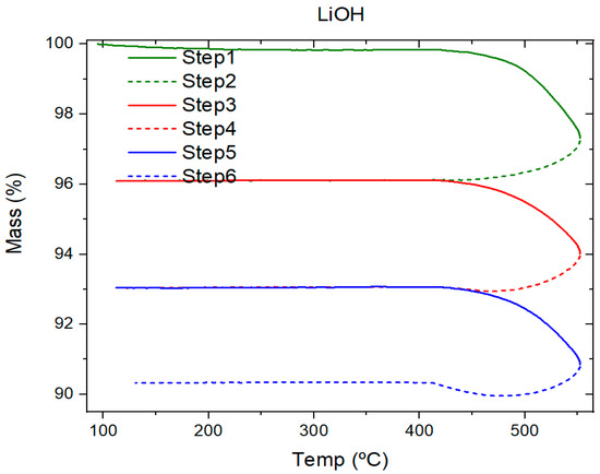 Finally, the TGA curve for LiOH (Figure 5) was carried out from 100 to 550 °C, due to the higher temperature range proposed for the industrial application. In this case, the thermal decomposition has started and it presents a higher increase beyond 500 °C. This is confirmed in the following thermal cycles, where a constant weight loss, around 2% at each thermal segment analyzed, was obtained.