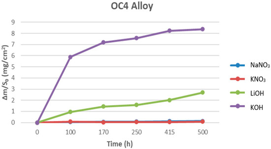 On the other hand, the highest corrosion rate was obtained for the OC4 alloy in contact with KOH (Figure 5), despite of the corrosion experiment was carried out at a lower temperature (380 °C) compared the lithium hydroxide salt.