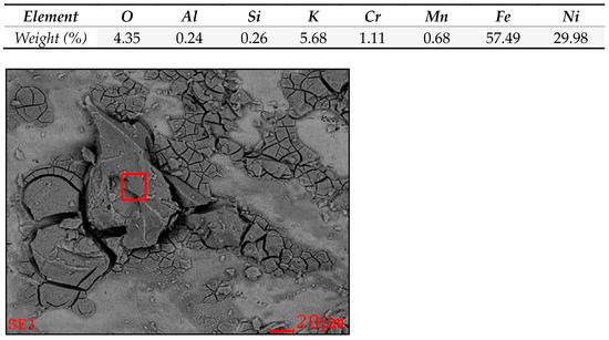 Scanning electron microscopy studies were carried out for the alloys immersed in lithium and potassium hydroxides, since they presented a higher gravimetric weight change. The superficial image and EDX analysis (at red mark) for OC4 alloy, immersed in LiOH at 470 °C during 500 h, is shown in Figure 7.