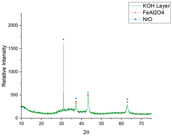 As observed in Figure 11, the corrosion layer formed in OC4 surface showed some cracks and spallation due to the low adherence of the corrosion layer to the alloy. One of these detached layers was analyzed by XRD (Figure 13). It was observed that one of the main protective products formed (FeAl2O4) was detected in the upper part of the layer formed, presenting a low adherence with the substrate and being easily removed from the alloy surface. In Table 4, a recommendation guide [30] for the levels of corrosion rates in industry is shown. According to this, the OC4 alloy would be recommended for use in contact with LiOH, NaNO3 and KNO3. In the case of KOH, depending on the application, this recommendation should be managed with caution since the weight gain obtained was 8.38 mg/cm2.