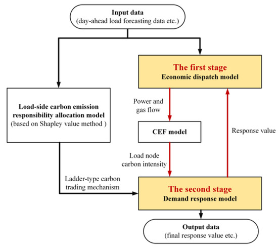 The two-stage low-carbon economic dispatch model considering the DR was employed to illustrate the source–load interaction coordination. The detailed process of the two-stage model is presented in Figure 2.