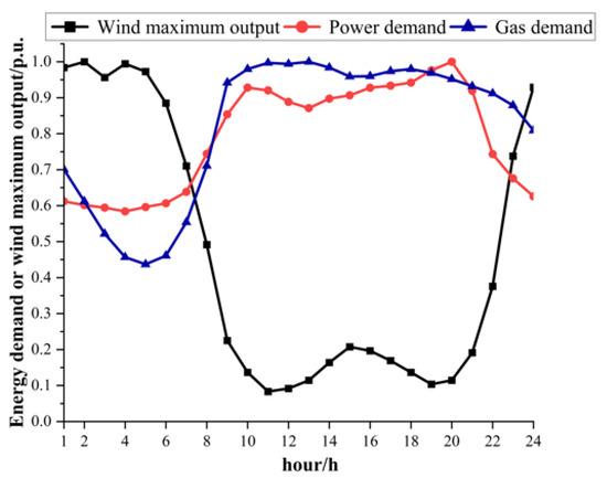 where represents the power generation cost coefficient of coal-fired units, which is determined by the fuel cost, power generation efficiency, and so on; is the power generation cost coefficient of the wind turbine, which is determined by the operation cost, maintenance cost, and so on; represents the cost coefficient of natural gas; and represents the outputs of the coal-fired units and wind turbines at time , respectively; denotes the output mass flow rate of the natural gas source at time .