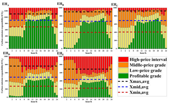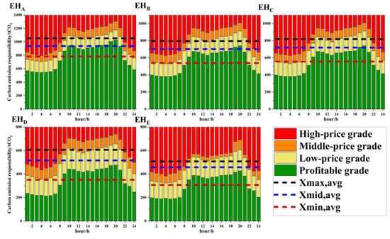 However, in practical engineering applications, it is impractical and difficult for each EH to update the carbon emission responsibility boundaries hourly. Therefore, in this study, the average values of the carbon emission responsibility boundaries of each EH for 24 h were taken as the carbon emission responsibility boundaries for the whole day, as shown in Equations (44)–(46).