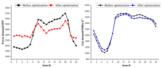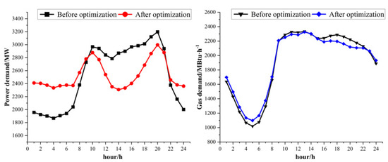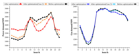 The power/gas demand before and after the optimization in Case 1 and Case 2.
