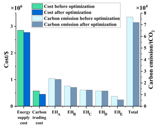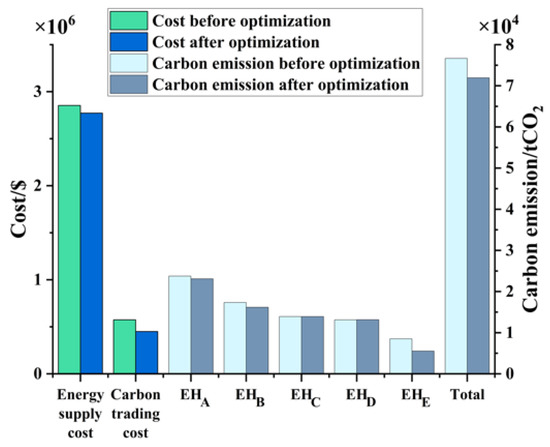 The energy supply cost, carbon trading cost, and carbon emissions of each EH before and after the optimization in Scenario 2.