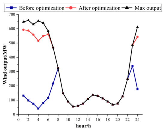 Figure 12 presents the energy supply cost, carbon trading cost, and carbon emissions before and after the optimization in Scenario 2. Compared with Figure 9, Figure 12 shows that the system energy supply cost and carbon emissions were significantly reduced after the optimization in the scenario including low-carbon and low-cost wind power. Specifically, the energy supply cost, carbon trading cost, and total carbon emissions were reduced by 2.9%, 21.7%, and 6.2%, respectively. From the above results of Scenario 2, it can be proven that the proposed model can not only effectively promote the load peak shaving and valley filling and reduce the load-side carbon trading cost, but also greatly improve the renewable energy consumption capacity of the IES, reducing the carbon emissions and energy supply cost.