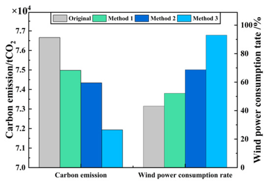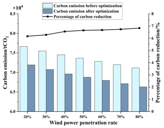 To investigate the effect of the two-stage model on the IES with different renewable energy penetration rates, the carbon emissions and percentages of carbon emission reduction after the optimization were studied with the wind power penetration rate (installed wind power capacity/system maximum system load) increasing from 20% to 80% in steps of 10%. As shown in Figure 13, an increase in the penetration rate led to the gradual reduction in the system carbon emissions, and the percentage of carbon reduction after the optimization remained basically stable, with a slight increase from 6.2% to 6.8%. Therefore, with the growth in renewable energy, the two-stage model considering the DR proposed in this paper can still effectively reduce carbon emissions.