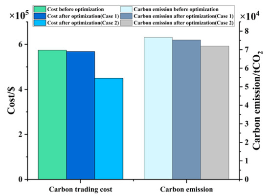 The carbon trading cost and carbon emissions before and after the optimization in Case 1 and Case 2.