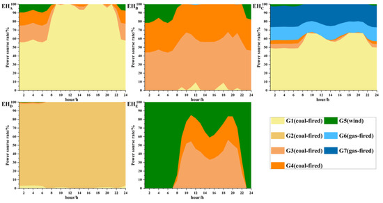 The load carbon emissions depend on the load carbon intensity and load value. Therefore, the impact of carbon emissions on the DR can be further investigated by focusing on the carbon intensity. The following discussion takes the power demand response in Scenario 2 as an example. According to the principle of proportional sharing [29], the carbon intensity of each bus is determined by the power component injected into the bus, and its value is the weighted average of the carbon intensity of each power component. The power composition of the five power loads in Scenario 2 is shown in Figure 17. The corresponding results of the bus carbon intensities are indicated by the blue line in Figure 18.