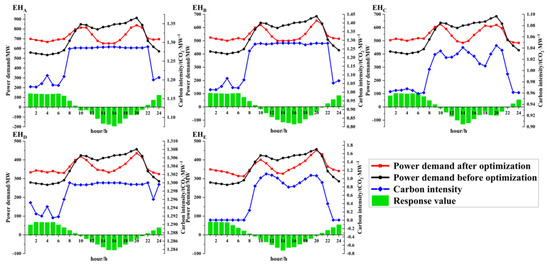 Figure 18 shows the relationship between the response value of each power load and bus carbon intensity. It can be seen from Figure 18 that in the period when the carbon intensity was relatively high, the load reduced the consumption of high-carbon power through a negative response. During the period when the carbon intensity was relatively low, the load increased the consumption of low-carbon power through a positive response to meet the conservation of total power demand. The response value is affected by the relative size of the carbon intensity, response range, response change ability, etc. Therefore, the carbon trading cost on the load side can be reduced by directly reducing the carbon emissions from energy consumption. Therefore, the carbon intensity difference caused by the renewable energy connected to the system can promote the DR to reduce the carbon trading cost on the load side.
