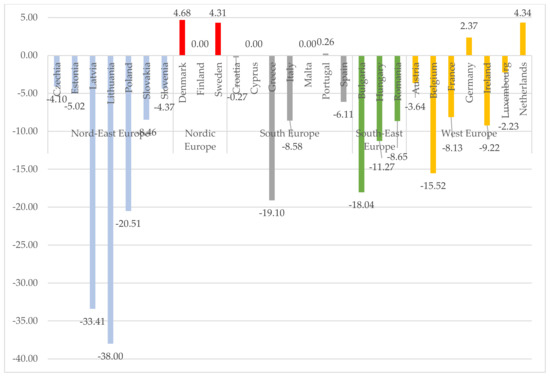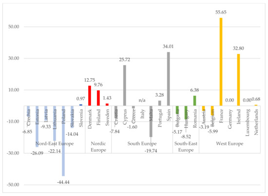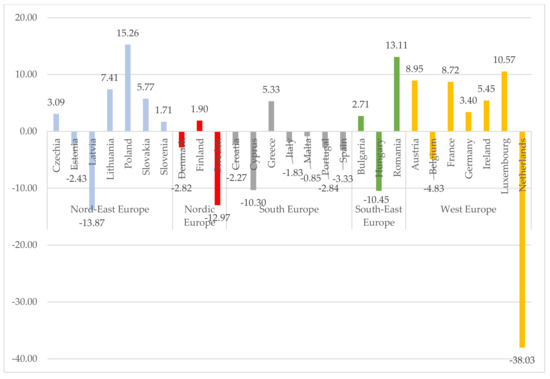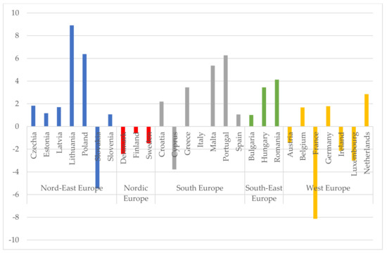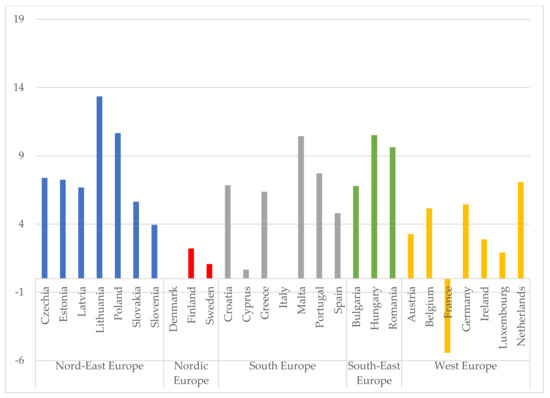 Figures below show the changes of mean net income in the period of 2019–2020 in euros (Figure 5) and in the purchasing power standard (Figure 6). Household incomes in euros have risen in all countries except France. The highest net income growth was in the northeastern, southeastern and southern countries. The biggest increase was found in Lithuania, reaching 13.34%. The analysis of income according to the purchasing power standard showed a decrease in income in all Nord group countries and even four countries of the western countries. The small increases in household income in euros and the decrease in revenue according to the purchasing power standard are the main reasons for the changes of the EU-SILC indicators presented earlier. The analysis of the first years of the pandemic already shows the impact on household income and confirms the statements raised after the analysis of the scientific literature (Figure 1). It can be assumed that the consequences of the pandemic will become even more pronounced in the following periods.