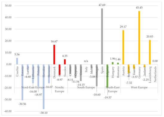 Changes in energy prices were measured over a two-year period. Rising electricity prices rose in many countries (Figure 8). More than ten percent points of electricity price increase were found in Poland, Romania and Luxembourg. Moreover, a significant decrease in electricity prices was observed in The Netherlands, Latvia, Sweden, Cyprus and Hungary. At the same time, gas prices had fallen in almost all countries (Figure 9). The most favorable changes for consumers were in the northeastern countries. Significant natural gas price declines were also seen in the southeast group countries. The analysis of statistical data confirms that the decline in household disposable income, rising energy prices and energy supply difficulties have increased the share of income of energy consumers to pay energy bills. Thus, the research confirms the hypothesis raised after the scientific literature review, that the pandemic increased the energy poverty among European households.