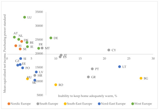 In the beginning of 2019, the world faced the COVID-19 pandemic [1], which was followed by the global energy crisis in the end of 2021. The energy prices increased significantly and the share of people unable to pay their bills for energy increased in many regions [2,3]. The European Union (EU) is dependent on imported energy, especially natural gas, where the biggest portion has come from Russia for many years [4]. Russia’s aggression against Ukraine, which began on 24 February 2022, and Europe’s response to the illegal invasion, have exacerbated the energy crisis in Europe. Energy prices have risen significantly; the government of Germany froze the certification of the Nord Stream 2. The burden of rising energy prices is falling on households through the rising prices of different products and services and a higher share of income for energy bills. According to the statistics, the population unable to adequately heat their homes rose almost 20% during the first year of the COVID-19 pandemic (from 6.9% to 8.2%) [5]. The results of the study by Che and Jiang [6] confirmed that economic uncertainty effects expenditure and energy poverty among people. Such conclusions have been reached in the analysis of both developing and developed countries, including nine European countries. It can be assumed that with significant increases in energy prices, energy poverty and the risk to face it will increase in the near future [7]. Therefore, it is very important to pay significant attention to this problem, both at regional and at a national level.
