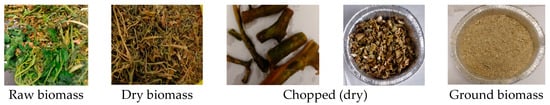 Dead tomato plant biomass was collected from two local greenhouses through the Ontario Ministry of Agriculture, Food and Rural Affairs (OMAFRA). Tomato plant stems, internodes, nodes, and leaves, along with petioles, were sun-dried (for easy grinding), chopped into minimum sizes of 3–5 mm and then crushed in a grinder. The steps in material preparation are shown in Figure 1.