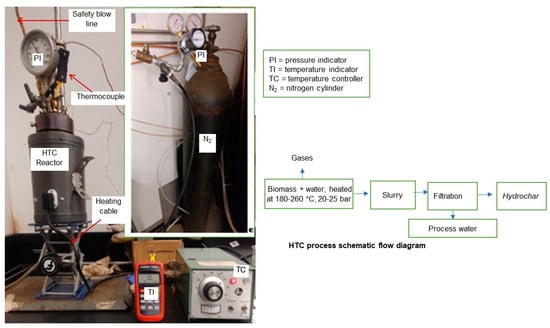 Biomass is a lignocellulosic material that includes forest and agricultural waste, sewage sludge, food waste etc. These materials have good potential to be used in biorefineries and other processing steps. Most of the biomass, including agricultural, forest, and greenhouse (GH), have inferior physicochemical properties, such as poor homogeneity, high moisture content, hydrophilic nature, poor grindability, high alkalinity and alkaline earth metal content, and low bulk energy density [3]. This inferior quality results in lower heating value, high ash content with low combustion efficiency (due to slug formation), and high cost of pre-drying and processing by conventional techniques, including torrefaction, pyrolysis, gasification, and liquefaction. All these treatment options involve high temperature processes, which cause complications, along with limitations, when treating biomass with high mist (water content) [4]. Among the developed technologies to pretreat biomass, hydrothermal carbonization (HTC), also referred to as wet torrefaction, is used in this study. It is an alternative to the traditional conversion method and is a convenient and promising technique, due to its adaptability to moisture content and varied biomass compositions [5,6].