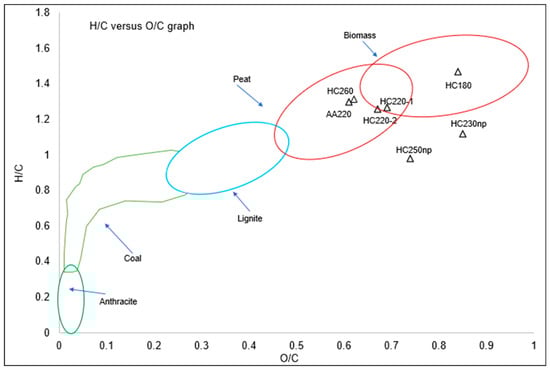 The two important atomic ratios, H/C and O/C were calculated using “mass %/atomic mass” of the respective elements and the well-known van Krevelen diagram was generated [48]. Figure 3 shows how the products behaved in comparison to typical carbon-based materials. Table 3 summarizes the results along with proximate data. For comparison, data on other biomass feedstocks, including HHV, are also included in Table 3. It should be mentioned here that the data in Table 3 are shown for one decimal; consequently, positions of H/C and O/C intersection points based on actual data values may look slightly different in Figure 3. For example, the O/C value for HC220-2 is 0.7 in Table 3, but the actual value is 0.67, shown in Figure 3. This also applies to other values as well (for example H/C values for HC220-1 and 2 are 1.26 each, but in Table 3 they are shown as 1.3).