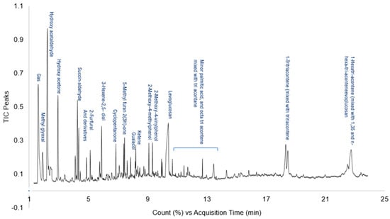 To determine different substances within HC samples, Gas Chromatography-Mass Spectrometry (GC-MS and Py-GC-MS) analyses were performed using single shot flash pyrolysis of samples to produce gases to send through to the Py-GC-MS (Pyrolysis-GC-MS). The conditions of pyrolysis were at 500 °C for one minute, and GC was kept at 300 °C. The analyzed data were integrated to obtain the peak areas by using F-search program. The areas (%) were identified and sorted with the help of Agilent Qualitative Analysis Software 10.0 and listed for comparison and interpretations. A total of 24 compounds were identified through the library search, which constituted about 80% of total substitutes. Out of 24 compounds, 11 pyrolites were sorted out as major compounds from the top listed concentrations and 13 compounds were found to have <2% concentration proportions. Table 4 shows a list of pyrolites, and Figure 5 shows the Py-GC/MS Total Ion Chromatogram (TIC) of the pyrolites, along with the respective names of the chemicals.