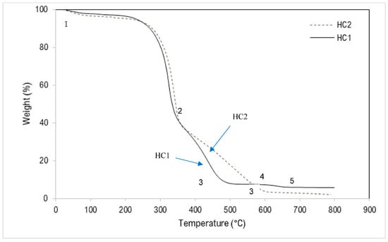 TGA was conducted following the procedure discussed earlier. Figure 6 shows the transformation of HC1 (220 °C) and HC2 (230 °C) on heating along with other TGAs from the literature for comparison. The thermal transformations that occurred in the 1st stage correspond to loss of moisture content up to 138 °C with a mass loss of about < 3.5% in the HCs, confirming the hydrophilic nature of the HCs. It was observed that most of the weight losses occurred in the 2nd temperature range, from 200–600 °C in the case of HC2, and 200–475 °C for HC1. After 600 °C (HC2) and 475 °C (HC1) there was no significant change of weight, even when the atmosphere changed from N2 to air. Major decomposition, mainly of basic organic compounds, including hemicellulose (180–340 °C), cellulose (280–400 °C), and lignin (340–450 °C) took place. The weight loss was accompanied with the formation of CO2, CH4 and water vapor (reaction products) in the off gasses. The 2nd region represents decomposition of polymers, about 90% reduction of weight. The residuals were about 4% and 7% from HC2 and HC1, respectively. The 4th and 5th regions represent the combustion of carbon, and the remaining residuals are inert inorganic/filler materials.