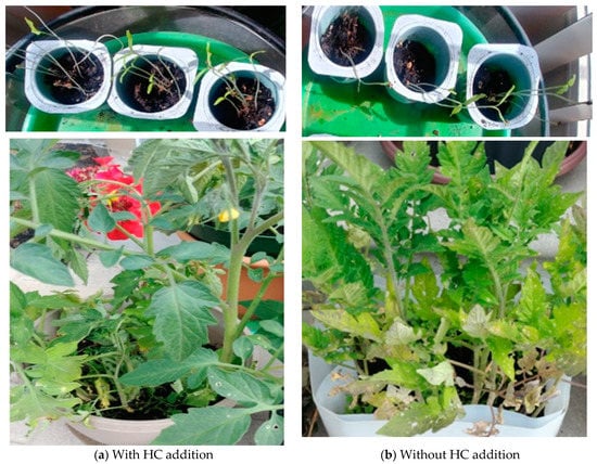 Tomato seeds were collected from a ripped tomato supplied by one of the partner GHs and planted in a series of six small planting pots, mixing about 0.5–1.0% of HC (washed to free from acids) with potting soil in three pots in series (left) and the other three pots in another series left only with potting soil without any HC addition (right). Normal tap water (about 5 mL) was sprayed every alternate day. Figure 7 shows the results of the effects of HC addition.