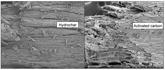 Figure 8 shows a comparative SEM photograph of hydrochar before and after activation, which clearly reveal that activated carbon developed a more porous surface compared to HC. It can be mentioned here that commercially activated carbon (AC) showed about 40–69% reduction of nutrients from GNF. Comparatively, HC performance seems encouraging in having extra scope for improvements. Application features of HC, surface functionality, morphological features, and reaction chemistry are affected by HTC operating conditions, manipulation of which would be the starting point for a further study. Material and elemental analysis suggest a new strategy handling 2–3 types of waste biomass at a time, such as Co-HTC treatment of TPB together with other greenhouse biomass (e.g., cucumber and/or pepper plant). This provides a great opportunity for valued utilization of all types of waste biomass generated in greenhouses.