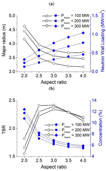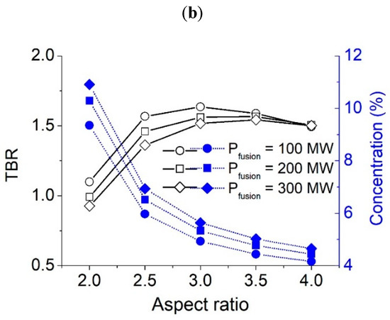 Figure 4 shows the optimal radial build of the transmutation reactor for (a) A = 2.0 with Pf,max = 100 MW in comparison to (b) A = 4.0 with Pf,max = 300 MW. In the case of (a), the required magnetic field at the plasma center (BT) was smaller, resulting in a larger major radius; the CS thickness was larger due to the greater plasma current, and the TF coil thickness was smaller due to the smaller magnetic field at the plasma center (BT); the inboard shield thickness was smaller due to smaller neutron wall-loading; the outboard blanket thickness was smaller for a given power density; and the distance between the vacuum vessel and the outer TF coil to satisfy the ripple requirement (maximum ripple <0.5%) was larger than those for case (b). As a result, the system dimension of case (b) was smaller than that of case (a).