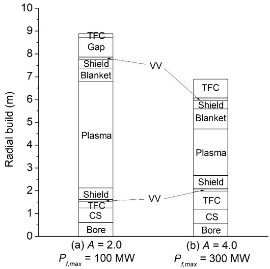 Optimal radial build of the transmutation reactor for (a) A = 2.0 with Pf,max = 100 MW, and (b) A = 4.0 with Pf,max = 300 MW, where TFC: toroidal field coil, CS: central solenoid, VV: vacuum vessel, and A: aspect ratio.