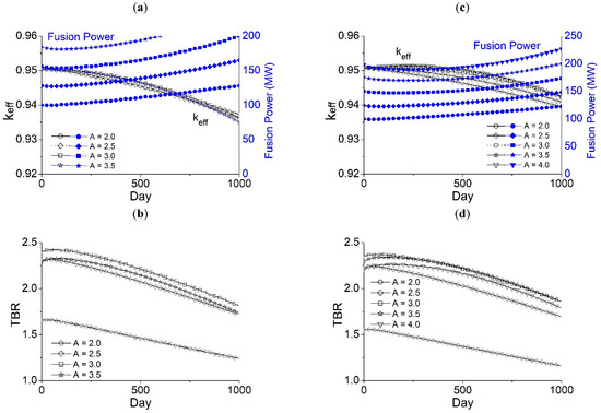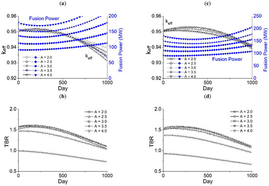 Variation of (a,c) keff and necessary fusion power, and (b,d) TBR as the TRU burned up with FLiNaBe. (a,b) Pf,m = 200 MW; (c,d) Pf,m = 300 MW.