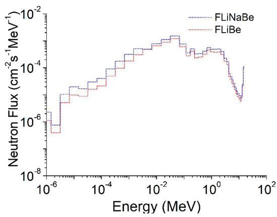 Comparison of the neutron energy spectrum with FLiBe and with FLiNaBe.