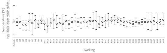 Minimum, maximum, and mean temperatures in living rooms of each monitored dwelling during the summer.