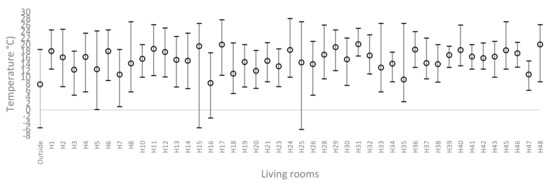 The summer field study involved the monitoring of the indoor temperature of 49 living rooms from 30 June to 12 August at half-hourly intervals to cover the hottest season of the year in the Albanian climate. The outdoor temperature ranged from 19.6 °C to 41.1 °C, while the indoor temperature ranged from 19.5 °C to 37 °C. The indoor temperature is well above the recommended temperature of 20 °C, considered as the comfortable temperature in living rooms by Albanian regulation [68], as shown in Figure 1.