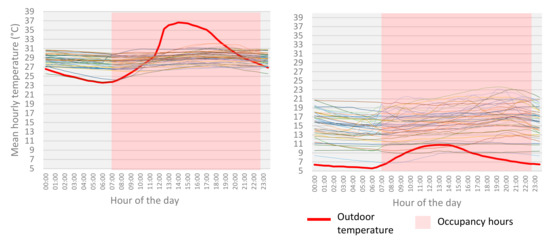 Mean hourly temperatures in living rooms during the summer (left) and winter (right). (Different colour lines represent the mean hourly temperature of the selected dwellings).