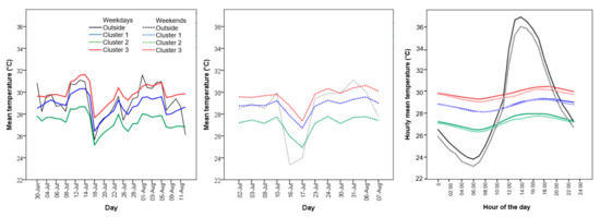 Figure 4 shows the daily and hourly mean temperatures of each cluster for both weekdays and weekends. All three clusters for both weekdays and weekends have the same sensitivity but in different temperature ranges, and the temperature profiles of weekends are very close to those of weekdays. Cluster 3 follows very closely the mean daily external temperature profile, which indicates that these dwellings might have been cooled for small periods or not at all. Cluster 1, representing most of the dwellings, has a mean daily temperature up to 3 °C lower than the external one during the hottest days of the summer. On the contrary, Cluster 2, which is the second most common cluster in the sample, has temperatures lower than the other two clusters, indicating actions from the occupants to maintain a cooler indoor temperature than in the other cases. The hourly mean temperature tends to be lower in the morning and starts to increase in the early afternoon, reaching a peak in the evening in Clusters 1 and 3 and in the late afternoon in Cluster 2.