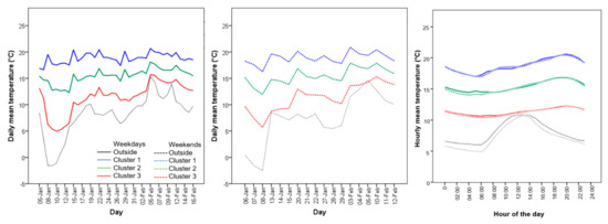 Figure 5 shows the daily and hourly mean temperatures of each cluster for both weekdays and weekends. Although both weekdays and weekends have the same membership of dwellings, the profiles are produced using absolute (instantaneous) temperature data, which differ between weekdays and weekends. The daily mean temperature is almost within the same range for both weekdays and weekends for each cluster. It was also observed that dwellings in Cluster 1 had temperatures above 15 °C during the coldest week of the monitoring time, while dwellings in Cluster 3 follow the external temperature profile more closely, indicating that some or all dwellings included in this cluster had little or no heating.