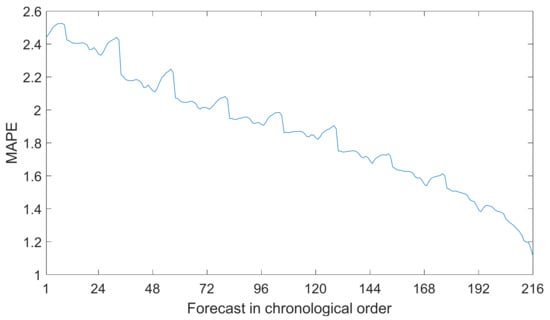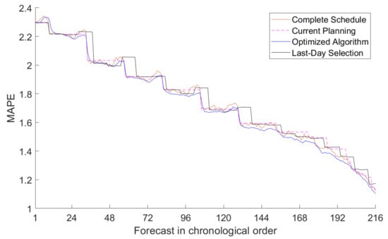 It was assumed that as we approach the forecast moment, the forecast becomes more accurate. However, this hypothesis does not always hold true. As an example, Figure 1 represents the mean absolute percentage error (MAPE) when predicting each hour of the Spanish national load, in 2019. Predicted values are distributed along the abscissa axis as they are executed hourly from 9 days before until the previous day. These forecasts are calculated with the auto-regressive model from REE []. There is an obvious trend in which accuracy increases as more recent information (weather and load) becomes available. Nevertheless, there seem to be some periods in which new forecasts are actually less accurate. The temperature data availability produces sudden drops in error, but during some periods the error increases. If accuracy loss periods can be known in advance, then the unproductive forecasts made at these times can be spared, saving computational effort while achieving a more accurate forecast. This paper aims to determine the optimal schedule of forecasts so that the system only computes new forecasts when an accuracy improvement is expected.