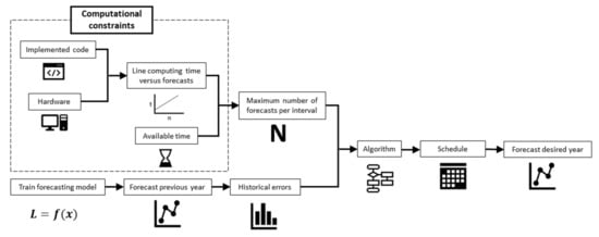 The Figure 2 shows how to use the algorithm in a forecasting system. First, the maximum number of predictions that can be calculated per interval is obtained, which depends on available time and computing power. At the same time, the previous year can be predicted to calculate historical error records. Finally, the algorithm is applied to obtain a schedule that will serve to forecast load during the next year.